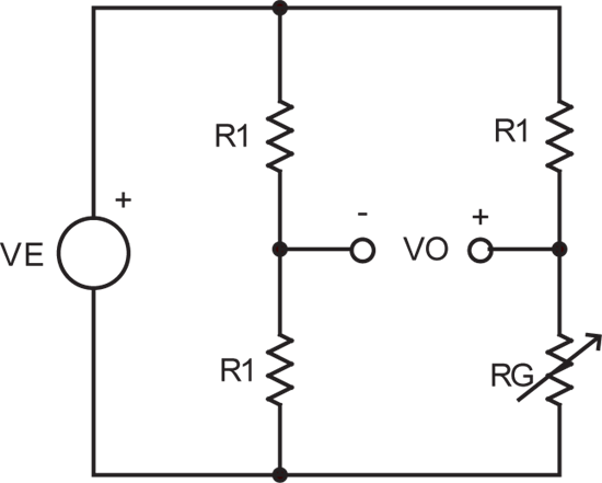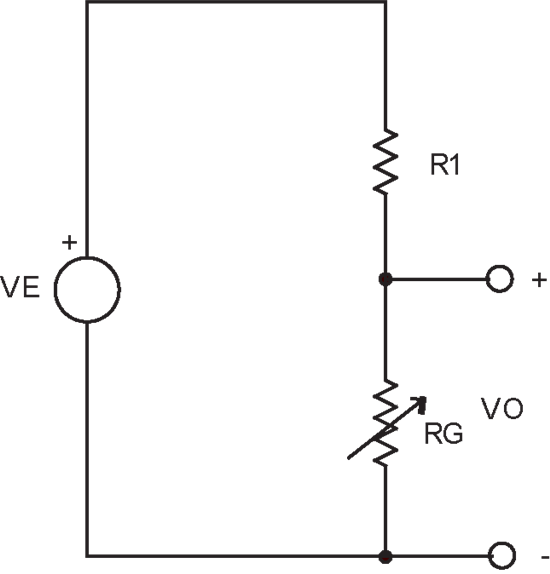 图 1 显示的是您如何使用一个分压器测量电阻。VE 表示激发电压。RG 值为: