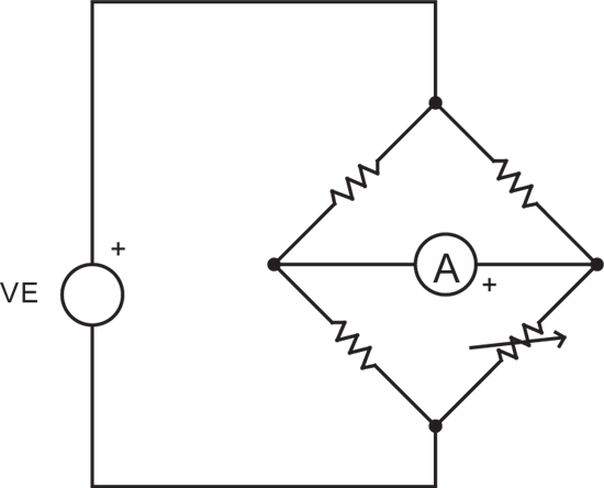 Wheatstone 桥接的原理是:如果交叉分支的三个电阻和电流均已知,则可计算得到第四个电阻。使用一个高灵敏度电流计,可以非常精确地探测到零电流,因此能够非常精确地实施测量。所以,当电流为零时,桥接获得平衡,而第四个电阻与其他三个电阻相等——但只有在这三个电阻都相等的条件下,如图 2-3 所示。