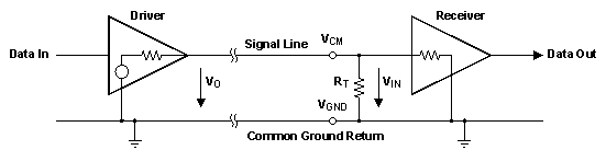 差动信号传输使用由两条导线组成的信号对:一个用于正向电流,而另一个用于返回电流。每个信号导线均有一个共模电压 VCM,其由 50% 差动驱动器输出 VOD 叠加,但极性相反(参见图 2)。