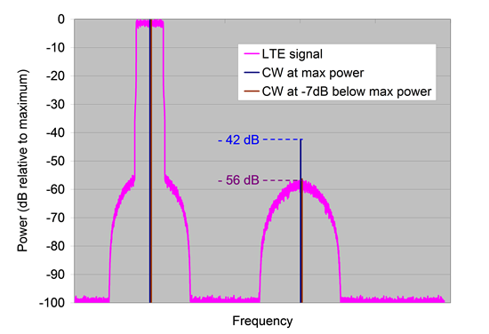CW 信号生成 CW 信号以下三阶失真结果 42 dB,而 LTE 信号生成 LTE 信号以下三阶失真结果 56 dB。请注意,图 2 所示功率已被标准化为每个信号的最大功率。
