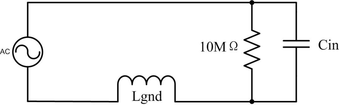 由于地夹线比较长,其会形成一个寄生电感Lgnd,随着夹线的增长,这个电感也会增大,而这个回路电感会和示波器探头的输入电容Cin产生谐振。这就导致示波器的幅频特性变得不平坦,导致测量不准确。其等效电路如图4所示:
