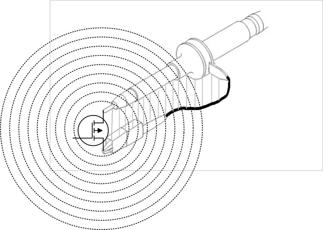 但是这还不是接地夹线最致命的。开关电源,随着开关管的开合,不仅仅产生了电源纹波,同时也产生了很多电磁干扰,通过空间进行辐射,而这部分辐射就会被接地夹线与探头形成的线圈给接收到,再加上示波器是高阻输入的,就导致这部分信号对测量的干扰非常可观。电磁干扰虽然也可以说是电源的一项参数,但是这部分信号是无法通过示波器探头来进行准确测量的,测量出来的值是毫无意义的。