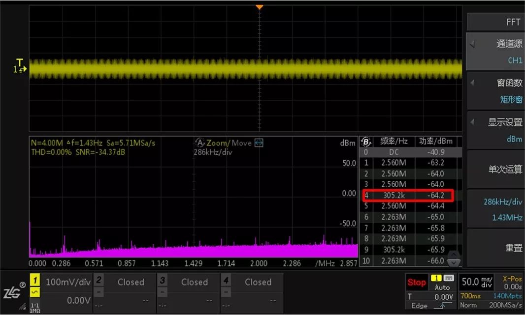 测量出电源纹波后,ZDS4000示波器还具有很多后期数据分析功能如峰峰值统计、最大值统计、最小值统计等。还有强大的FFT功能。我们可以通过FFT功能,对得到的纹波波形进行频率上的分析,这样可以准确的知道每个频点上的噪声大小。这样就可以更加准确的得到由开关引起的纹波大小,如图10所示: