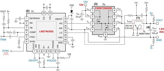 (3) MOSFET — 功率半导体器件是改善效率与尺寸的基础。以功率块 NexFET™ 系列为例,其被广为称道的优势在于通过垂直叠加的方式创新地将高侧及低侧 MOSFET 进行联合封装。在频率比例损耗值得关注时,需要低 QG、QRR 与 QOSS 电荷。此外,低 RDS(ON)、大电流铜夹、开尔文栅极连接以及接地选项卡也很重要。