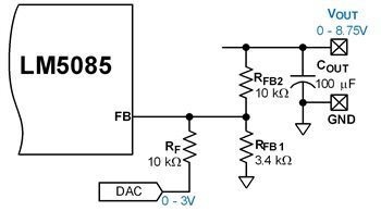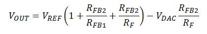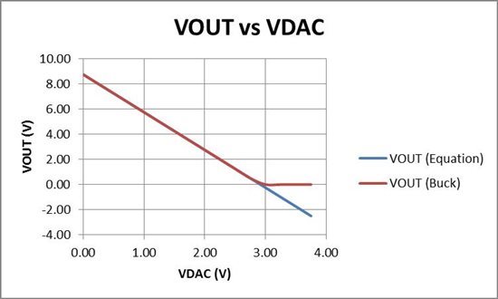 以上方程式表明,当 VDAC 为最小值时 VOUT 达到最大。如果以上方程式的最小 VOUT 是负值,那么就应该是 VOUT=0V – 降压转换器的最小输出电压(当采用单极电源供电时)。