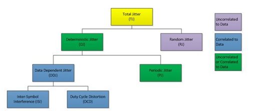 既然我们了解了眼状图,就可提出这样一个问题“什么是抖动?”抖动可定义为不希望看到的、信号理想转换位置的高频率偏移。抖动可分为总体抖动 (TJ)、随机抖动 (RJ) 和确定性抖动 (DJ)。顾名思义,总体抖动 (TJ) 包含所有抖动组成部分的影响。下图 2 中的流程图是 TJ 及其所有组件的分解图: