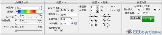 A:运行WENBENCH软件,进入LED设计界面,输入要设计的LED电源参数。过滤选择结果,选择白光white,配置每颗LED,工作电流0.35A,正激电压3.0V,动态电阻0.75欧姆。每串8个LED白光灯珠,总电压24V。并联数量选择4,总电流为1.4A。驱动电源的直流输入范围:30V--45V,环境温度60°C。