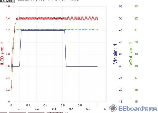 开始新的仿真,,在LED驱动器原理图上,选择仿真波形测试点软件经过计算,经过一段时间后,完成第一次电路仿真,出现成功,然后,点击Uou和U in等观察,时间轴单位是10-3次方=1ms.在点击查看其他叠加波形,,ID1,