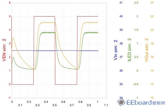 由图可见,所选的PWM信号的占空比为D=50%,方波,变化范围是0-5V,从图仿真图可以看出,PWM周期T=0.5×10-3s=0.5ms.所对应的调光频率f=2KHz.C:点击ILED,可以同时仿真其他波形,可以将前面的不调光和调光的波形进行对比,不难看出,ILED波形和Uen波形保持同步,仅有一点滞后,当D=50%时,电流平均值为由0.305A。