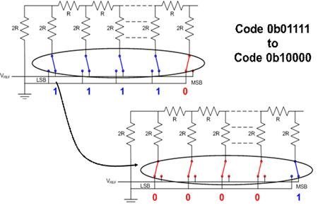DAC 输出进入主要进位转换后,会导致所有 R-2R 开关短时间接地。