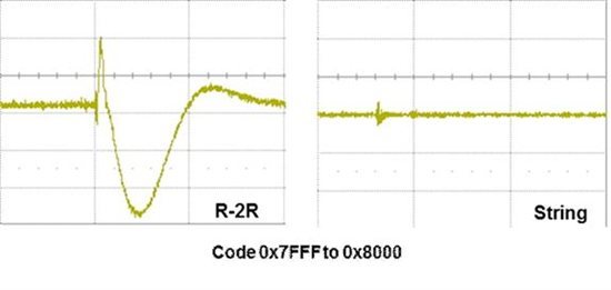 图5:R-2R 与电阻串 DAC 的输出干扰对比