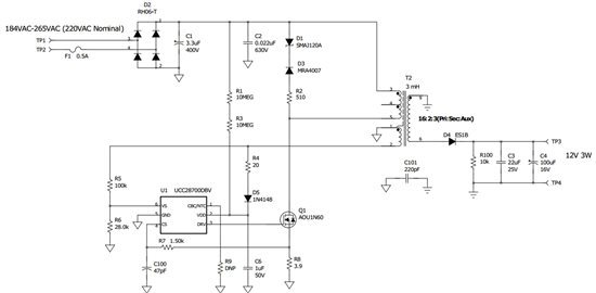 在图 1 的实例中,要使用通用 AC 输入(85VAC 至 264VAC)实现 12V/50mA 的偏置电源,需要为 R2 应用 2kΩ 的最大电阻器。即便使用串联电阻器,仍需补偿 BJT 上的损耗,在输入为 264VAC 时其可高达 5W。
