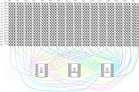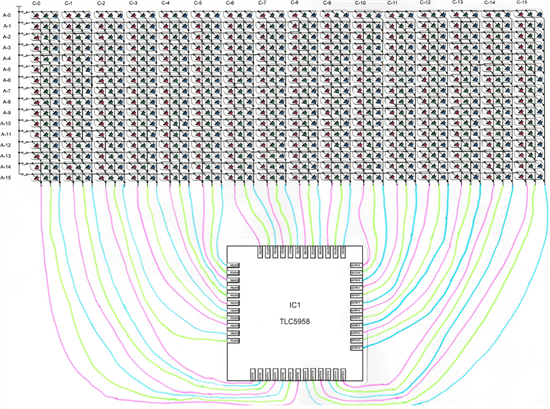 以下是采用 3 个 16 输出驱动器的普通 LED 布局与采用 1 个 48 输出驱动器的相同布局的比较。在每张图的上半部分有 256 (= 16 × 16) 个 RGB 3 合 1 LED 灯,相当于 768 个独立 LED 灯。使用 48 通道驱动器可显著简化设计,无需线路跨接。