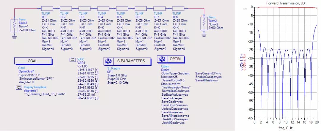 获取阻抗变换器阶数和参数的小软件非常多,这里通过在ADS中建模仿真获取相应参数,模型见图2,其中有效介电常数可以通过传输线计算工具大概获取,长度初值为中心频率的1/4波长,其他阻抗值从高到低排列就好,经过简单优化即可以获取各级阻抗。