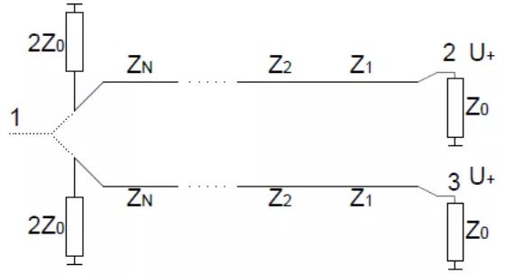 ·对于公共的1端口,奇模馈电对它不起作用,只要分析偶模电路即可,1口的回波和偶模电路的1口回波是相等的。由此功分器的传输线设计就变成了设计一个2*Zo到Zo欧的阻抗变换器。