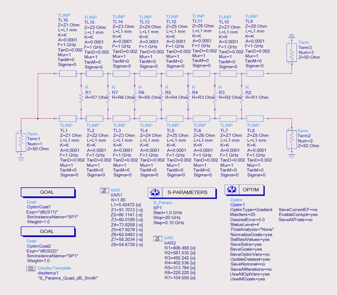根据第二步的结果,在ADS中建立完整的功分器理论模型,固定传输线参数,加入隔离电阻,任意给定一个初值,通过一次2端口驻波优化就可以很方便的获取隔离电阻的数值。该电路优化结果见图3。