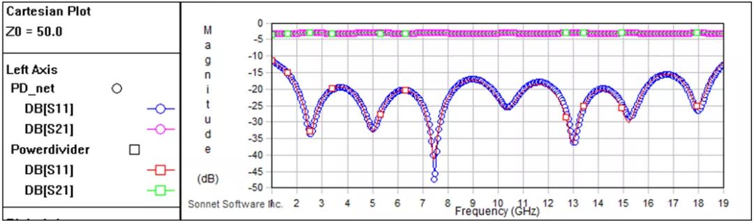 功分器整体仿真就是将阻抗变换器和T型节组合成图4的功分器整体进行仿真,在这里顺便介绍一下sonnet的netlist电路仿真。在sonnet中新建一个netlist电路如图7所示,这种实际上是把第4)步的子电路联合起来进行的仿真。其他的大型电路均可通过此方式划成小电路然后用netlist把各个子电路联合起来,这样可以加快仿真和优化速度。Netlist电路仿真结果和全电路仿真结果对比见图7,可以看出电路分割的正确性以及整个功分器电路仿真过程的准确性。最后把电阻带入后,整个功分器就基本仿真完成了。
