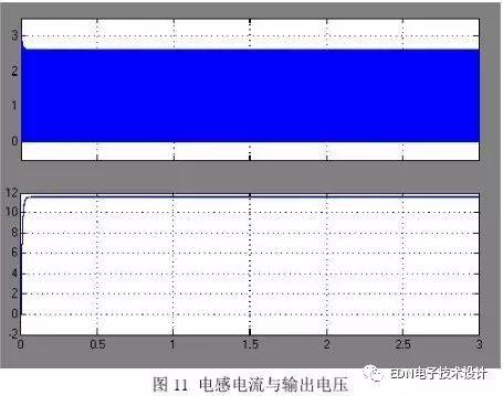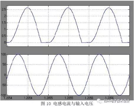 根据此图可以看出电容的电压为一个正值,相当于整流电路的效果。下面给出比较图:图 10 是交流输入,电流单向的输出效果。上面为电感电流下面为输入电压值,可以看出二者相位不同。图11 上面为电感电流,下面是输出电压值。可以看出输出是恒压效果。