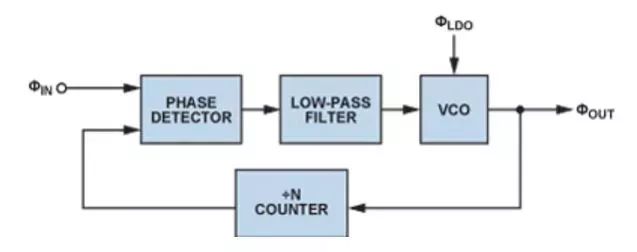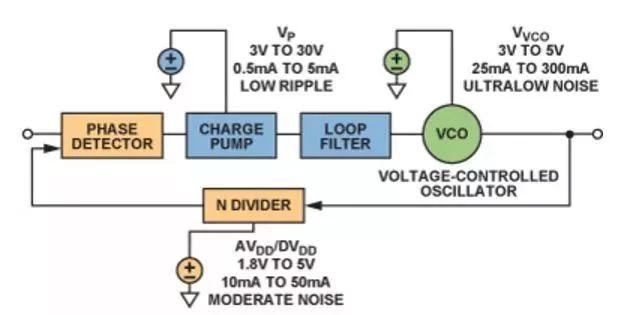 由于每一代PLL的噪声性能都在改善,因此电源噪声的影响变得越来越明显,某些情况下甚至可限制噪声性能。我们今天讨论下图1所示的基本PLL方案,并考察每个构建模块的电源管理要求。