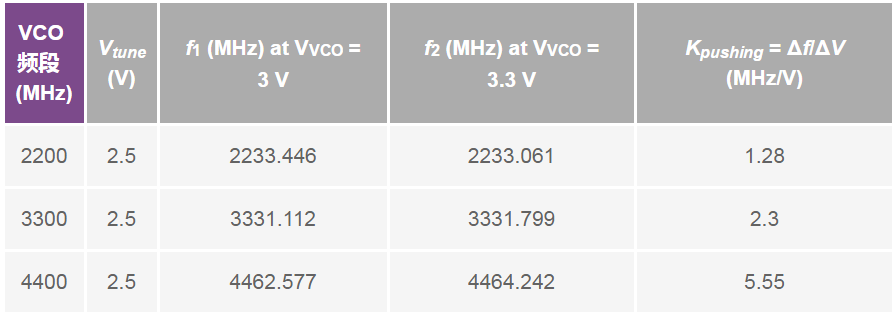 VCO推压的测量方法如下:向VTUNE引脚施加直流调谐电压,改变电源电压并测量频率变化。推压系数是频率变化与电压变化之比,如表1所示,使用的是ADF4350 PLL。