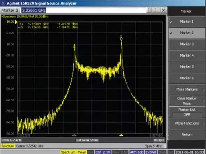 图2显示ADF4350 VCO输出在3.3 GHz、对标称3.3 V电源施加10 kHz、0.6 Vp-p方波时的频谱分析仪曲线图。对于1.62 MHz/0.6 V或2.7 MHz/V的推压系数,最终偏差为3326.51 MHz – 3324.89 MHz = 1.62 MHz。该结果可与表1中的静态测量 2.3 MHz/V比较。