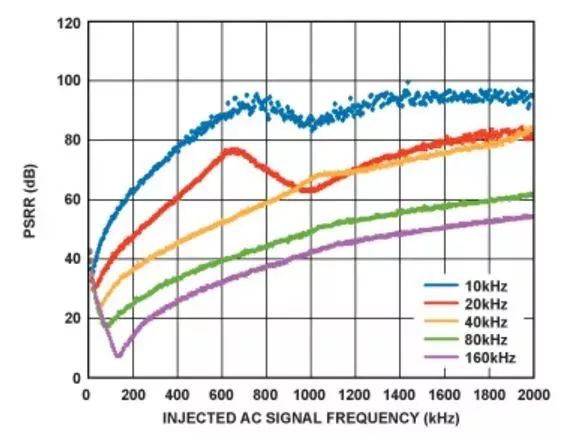 在PLL环路带宽内,随着频率增加,电源抑制最初变差。随着频率接近PLL环路带宽,纹波频率以类似于基准噪声的方式衰减,PSR改善。该曲线图显示,需要具有较高开关频率(理想情况下大于1 MHz)的升压转换器,以便尽可能降低开关杂散。另外,PLL环路带宽应尽可能降至最低。