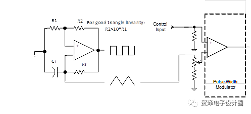 一个简单的脉宽调制电路。最直接的方法可能是放一个具有方波输出的振荡器,再用一个积分器为比较器提供一个三角波形,其控制输入用于脉冲宽度,如图1所示。虽然该电路工作正常,但今天介绍的是如何使用输入作为输出以节省一个运算放大器。
