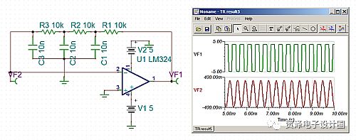 图4示出了用于产生正弦波的相移振荡器原理图和仿真。
