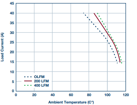 图5. 热衰减表明在83°C最高环境温度、200 LFM下,全电流可达40 A