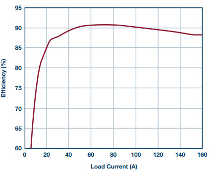 图10. 这款140 W的调节器搭载4个并行运行的LTM4636,采用精确电流共享模式,在160 A应用中,12 V输入电压转换为0.9 V输出电压的效率非常出色