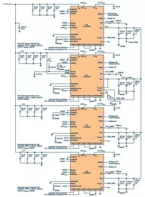 图10所示为完整的160 A设计。注意,LTM4636无需时钟器件即可相互反相工作——包括时钟和相位控制。多相工作模式下可以减少输出和输入纹波电流,从而减少所需输入和输出电容的数量。在图10中,4个LTM4636相互反相90°。
