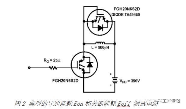 这种延迟引起了类饱和 (Quasi-saturation) 效应,使集电极/发射极电压不能立即下降到其VCE(sat)值。这种效应也导致了在ZVS情况下,在负载电流从组合封装的反向并联二极管转换到 IGBT的集电极的瞬间,VCE电压会上升。IGBT产品规格书中列出的Eon能耗是每一转换周期Icollector与VCE乘积的时间积分,单位为焦耳,包含了与类饱和相关的其他损耗。其又分为两个Eon能量参数,Eon1和Eon2。Eon1是没有包括与硬开关二极管恢复损耗相关能耗的功率损耗;Eon2则包括了与二极管恢复相关的硬开关导通能耗,可通过恢复与IGBT组合封装的二极管相同的二极管来测量,典型的Eon2测试电路如图2所示。IGBT通过两个脉冲进行开关转换来测量Eon。第一个脉冲将增大电感电流以达致所需的测试电流,然后第二个脉冲会测量测试电流在二极管上恢复的Eon损耗。
