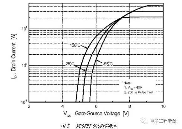 假定在导通时,FET电流上升到10A,根据图3中25℃的那条曲线,为了达到10A的值,栅极电压必须从5。2V转换到6。7V,平均GFS为10A/(6。7V-5。2V)=6。7mΩ。