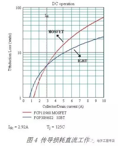 公式1 获得所需导通di/dt的栅极驱动阻抗把平均GFS值运用到公式1中,得到栅极驱动电压Vdrive=10V,所需的 di/dt=600A/μs,FCP11N60典型值VGS(avg)=6V,Ciss=1200pF;于是可以计算出导通栅极驱动阻抗为37Ω。由于在图3的曲线中瞬态GFS值是一条斜线,会在Eon期间出现变化,意味着di/dt也会变化。呈指数衰减的栅极驱动电流Vdrive和下降的Ciss作为VGS的函数也进入了该公式,表现具有令人惊讶的线性电流上升的总体效应。同样的,IGBT也可以进行类似的栅极驱动导通阻抗计算,VGE(avg) 和 GFS可以通过IGBT的转换特性曲线来确定,并应用VGE(avg)下的CIES值代替Ciss。计算所得的IGBT导通栅极驱动阻抗为100Ω,该值比前面的37Ω高,表明IGBT GFS较高,而CIES较低。这里的关键之处在于,为了从MOSFET转换到IGBT,必须对栅极驱动电路进行调节。传导损耗需谨慎在比较额定值为600V的器件时,IGBT的传导损耗一般比相同芯片大小的600 V MOSFET少。这种比较应该是在集电极和漏极电流密度可明显感测,并在指明最差情况下的工作结温下进行的。例如,FGP20N6S2 SMPS2 IGBT 和 FCP11N60 SuperFET均具有1℃/W的RθJC值。图4显示了在125℃的结温下传导损耗与直流电流的关系,图中曲线表明在直流电流大于2。92A后,MOSFET的传导损耗更大。