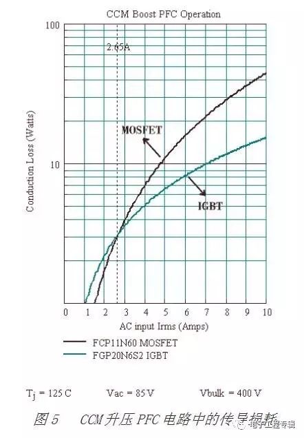 公式2 CCM PFC电路中的RMS电流式2中,Iacrms是PFC电路RMS输入电流;Vac是 PFC 电路RMS输入电压;Vout是直流输出电压。在实际应用中,计算IGBT在类似PFC电路中的传导损耗将更加复杂,因为每个开关周期都在不同的IC上进行。IGBT的VCE(sat)不能由一个阻抗表示,比较简单直接的方法是将其表示为阻抗RFCE串联一个固定VFCE电压,VCE(ICE)=ICE×RFCE+VFCE。于是,传导损耗便可以计算为平均集电极电流与VFCE的乘积,加上RMS集电极电流的平方,再乘以阻抗RFCE。图5中的示例仅考虑了CCM PFC电路的传导损耗,即假定设计目标在维持最差情况下的传导损耗小于15W。以FCP11N60 MOSFET为例,该电路被限制在5。8A,而FGP20N6S2 IGBT可以在9。8A的交流输入电流下工作。它可以传导超过MOSFET 70% 的功率。虽然IGBT的传导损耗较小,但大多数600V IGBT都是PT (Punch Through,穿透) 型器件。PT器件具有NTC (负温度系数)特性,不能并联分流。或许,这些器件可以通过匹配器件VCE(sat)、VGE(TH) (栅射阈值电压) 及机械封装以有限的成效进行并联,以使得IGBT芯片们的温度可以保持一致的变化。相反地,MOSFET具有PTC (正温度系数),可以提供良好的电流分流。关断损耗——问题尚未结束在硬开关、钳位感性电路中,MOSFET的关断损耗比IGBT低得多,原因在于IGBT 的拖尾电流,这与清除图1中PNP BJT的少数载流子有关。图7显示了集电极电流ICE和结温Tj的函数Eoff,其曲线在大多数IGBT数据表中都有提供。 这些曲线基于钳位感性电路且测试电压相同,并包含拖尾电流能量损耗。