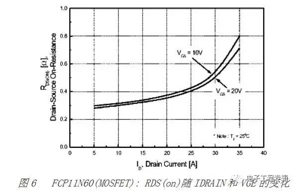 一篇名为“如何将功率MOSFET的RDS(on)对漏极电流瞬态值的依赖性包含到高频三相PWM逆变器的传导损耗计算中”的IEEE文章描述了如何确定漏极电流对传导损耗的影响。作为ID之函数,RDS(on)变化对大多数SMPS拓扑的影响很小。例如,在PFC电路中,当FCP11N60 MOSFET的峰值电流ID为11A——两倍于5。5A (规格书中RDS(on) 的测试条件) 时,RDS(on)的有效值和传导损耗会增加5%。在MOSFET传导极小占空比的高脉冲电流拓扑结构中,应该考虑图6所示的特性。如果FCP11N60 MOSFET工作在一个电路中,其漏极电流为占空比7。5%的20A脉冲 (即5。5A RMS),则有效的RDS(on)将比5。5A(规格书中的测试电流)时的0。32欧姆大25%。