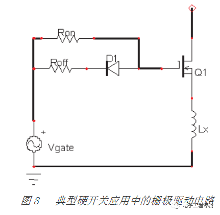 图2显示了用于测量IGBT Eoff的典型测试电路, 它的测试电压,即图2中的VDD,因不同制造商及个别器件的BVCES而异。在比较器件时应考虑这测试条件中的VDD,因为在较低的VDD钳位电压下进行测试和工作将导致Eoff能耗降低。降低栅极驱动关断阻抗对减小IGBT Eoff损耗影响极微。如图1所示,当等效的多数载流子MOSFET关断时,在IGBT少数载流子BJT中仍存在存储时间延迟td(off)I。不过,降低Eoff驱动阻抗将会减少米勒电容 (Miller capacitance) CRES和关断VCE的 dv/dt造成的电流注到栅极驱动回路中的风险,避免使器件重新偏置为传导状态,从而导致多个产生Eoff的开关动作。ZVS和ZCS拓扑在降低MOSFET 和 IGBT的关断损耗方面很有优势。不过ZVS的工作优点在IGBT中没有那么大,因为当集电极电压上升到允许多余存储电荷进行耗散的电势值时,会引发拖尾冲击电流Eoff。ZCS拓扑可以提升最大的IGBT Eoff性能。正确的栅极驱动顺序可使IGBT栅极信号在第二个集电极电流过零点以前不被清除,从而显著降低IGBT ZCS Eoff 。MOSFET的 Eoff能耗是其米勒电容Crss、栅极驱动速度、栅极驱动关断源阻抗及源极功率电路路径中寄生电感的函数。该电路寄生电感Lx (如图8所示) 产生一个电势,通过限制电流速度下降而增加关断损耗。在关断时,电流下降速度di/dt由Lx和VGS(th)决定。如果Lx=5nH,VGS(th)=4V,则最大电流下降速度为VGS(th)/Lx=800A/μs。