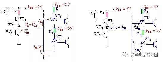 当逻辑门输出端是高电平时,逻辑门输出端的电流是从逻辑门中流出,这个电流称为拉电流。拉电流越大,输出端的高电平就越低。这是因为输出级三极管是有内阻的,内阻上的电压降会使输出电压下降。拉电流越大,输出端的高电平越低。