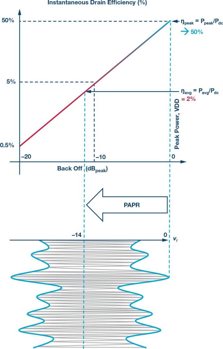 图1概要显示了典型的电缆应用。尽管该系统功耗近80 W,但仅传送了2.8W信号功率。功率放大器是功效极低的A类架构。最大瞬时峰值效率可以计算为50%(当信号包络最大时,假定为电感负载)。如果功率放大器完全在线性区域工作,则考虑电缆信号的极高峰均比(通常为14 dB)意味着放大器需要比信号压缩开始时平均低14 dB的工作条件,从而确保即使在信号的峰值处也不会发生信号压缩。回退与放大器工作效率直接相关。当放大器回退14 dB以适应各种电缆信号时,工作效率将降低10–14/10。因此,工作效率从理论上的最大值50%降低到10–14/10× 50% = 2%。图2概要显示了上述情况。