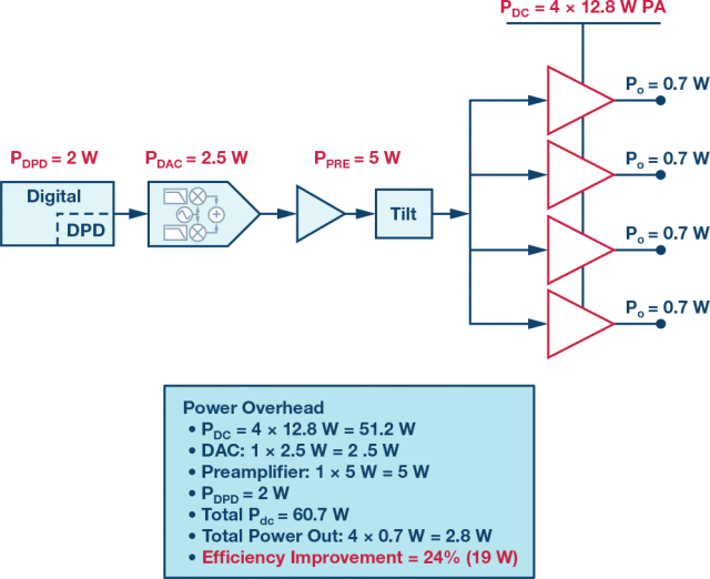 如图4所示,电缆应用的实际工作效率约为3.5%!实施数字预失真可以降低系统的功率要求,由原来的80 W降低到61 W,节约19 W,节电率达到24%。每个功率放大器以前的功率要求为17.5 W,现在则下降到12.8 W。