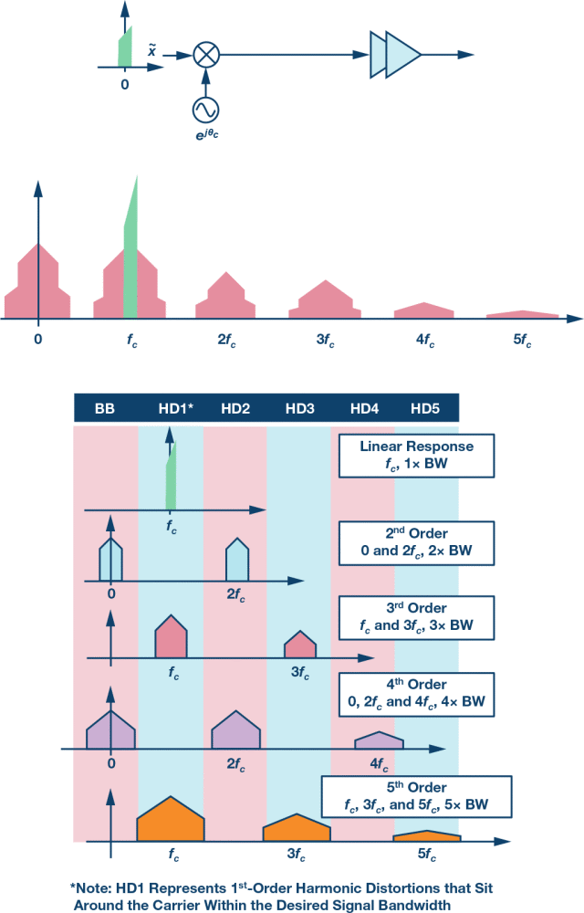 在窄带系统中,偶数阶项可以被忽略,奇数阶在每个目标频带内产生1个项。电缆应用中的数字预失真必须考虑奇数阶和偶数阶谐波失真,并且还必须考虑到每个阶可能有多个重叠的带内元素。
