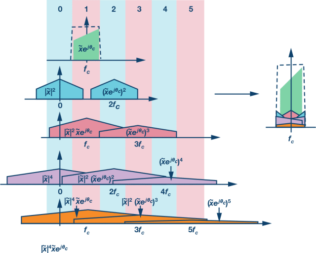 可将其理解为有记忆效应的Taylor幂级数的推广。值得注意的是,每个非线性项(k = 1,2, … , K)都会产生多个谐波失真(HD)产物。例如,五阶有3个谐波项:一次谐波、三次谐波和五次谐波。另外需要注意的是,谐波带宽是其阶次的倍数。例如,三阶谐波项的宽度是激励带宽的3倍。