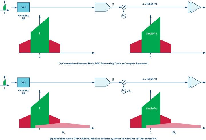 如图8所示,传统窄带数字预失真在复杂基带处完成。在这些实例中,仅一次谐波产物在频带范围内,因此其基带产物直接转换为RF。考虑宽带电缆数字预失真时,较高阶次的谐波失真必须是频率偏移,才能使上变频后的基带产物正确位于实际RF频谱中。