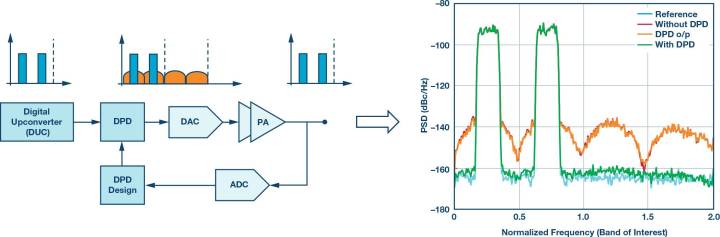 对于这样的窄带系统,只有一次谐波周围的带内失真需要通过数字预失真消除,因为采用带通滤波器可去除所有其他产物。另外还需注意的是,由于带内没有偶数阶产物,数字预失真只需处理奇数阶项。