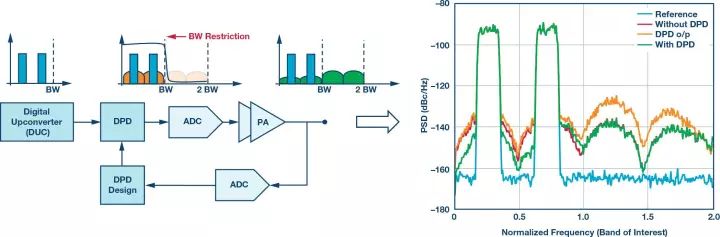 在实际方案中,信号路径具有带宽限制,数字预失真性能无法达到理想方案要求。