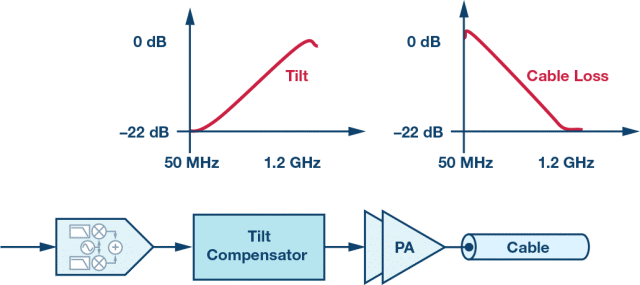 通过被称为倾斜补偿器(位于功率放大器之前)的低功耗无源模拟均衡器即可实现整形。在高频下衰减少或不衰减,而在低频下衰减大。倾斜补偿器输出端的信号在整个工作频谱范围内可具有高达22 dB的均衡增益变化。