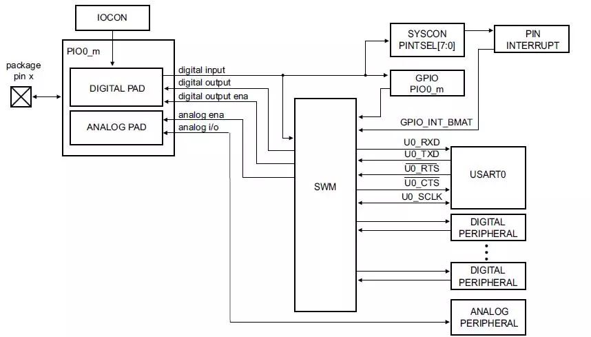 开关矩阵是一种内部路径可灵活配置的功能模块,可将MCU各个外设功能的信号作为开关矩阵的入口,各个复用I/O端口便是对应的出口,通过相应寄存器配置,能够把特定外设功能灵活分配到所需的引脚。在LPC8xx系列中,可以通过开关矩阵分配外设有:三路串口USART0/1/3、两路SPI0/1、SCT定时器的多路输入及输出、两路I2C1/2、ADC模块、模拟比较器ACMP输出、时钟频率输出CLKOUT及GPIO中断输出。
