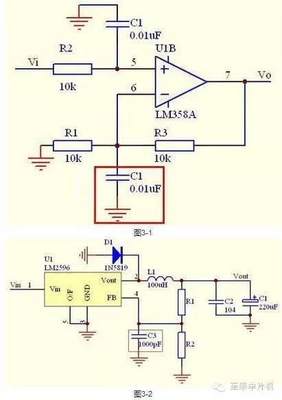 如图3-1所示,同样是一个用于直流信号放大的电路,为了去耦,不小心把电容并接到了反馈回路,反馈信号的相位发生了改变,很容易就会发生振荡。所以,在放大电路中,反馈回路不能加入任何影响信号相位的电路。由此延伸至稳压电源电路,如图3-2,并接在反馈脚的C3是错误的。为了降低纹波,可以把C3与R1并联,适当增大纹波的负反馈作用,抑制输出纹波。