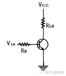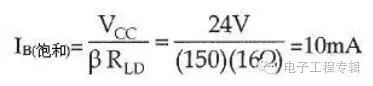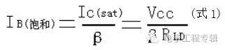 上式表出了IC和IB之间的基本关系,式中的β值代表三极管的直流电流增益,对某些三极管而言,其交流β值和直流β值之间,有着甚大的差异。欲使开关闭合,则其Vin值必须够高,以送出超过或等于(式1)式所要求的最低基极电流值。由于基极回路只是一个电阻和基射极接面的串联电路,故Vin可由下式来求解﹕
