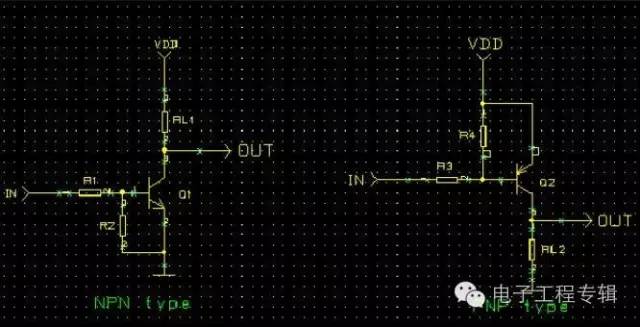 晶体管开关电路(工作在饱和态)在现代电路设计应用中屡见不鲜,经典的74LS,74ALS等集成电路内部都使用了晶体管开关电路,只是驱动能力一般而已。TTL晶体管开关电路按驱动能力分为小信号开关电路和功率开关电路;按晶体管连接方式分为发射极接地(PNP晶体管发射极接电源)和射级跟随开关电路。1.发射极接地开关电路1.1NPN型和PNP型基本开关原理图: